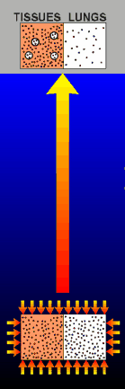 In the diagram at right, the top figure (1) represents a close-up of the interface between the lungs and the blood and tissues of a diver. At sea level, the dissolved gases in the blood and tissues are in proportion to the partial pressures of the gases in the person's lungs at the surface. As the diver descends underwater, the ambient pressure increases, and therefore the pressure of the gas inside the lungs increases correspondingly. Because the partial pressures of the gases in the lungs are now greater than the dissolved partial pressures of these gases in the blood in tissues, gas molecules begin to move from the lungs into the blood and tissues (represented by the blue and red arrows in the middle figure, 2). Eventually, the concentration of the dissolved gases in the blood and tissues will be proportional to the the partial pressures in the breathing gas (i.e., a state of equilibrium).
